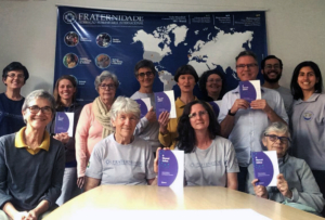 أعضاء فريق الترجمة والنشر يحملون نسخًا من الدليل باللغة البرتغالية البرازيلية والذي تم إصداره حديثًا. الصورة: Fraternidade-Federação Humanitária Internacional (الاتحاد الإنساني الدولي)