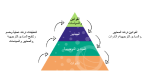 الشكل التالي يوضح العلاقة بين القوانين/السياسات والمعايير والتوجيهات والأدوات.