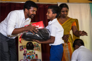 Firzan Hashim entrega útiles escolares a los alumnos de Pitabeddara que los perdieron durante las inundaciones y deslizamientos de 2017. Foto: A-PAD Sri Lanka.