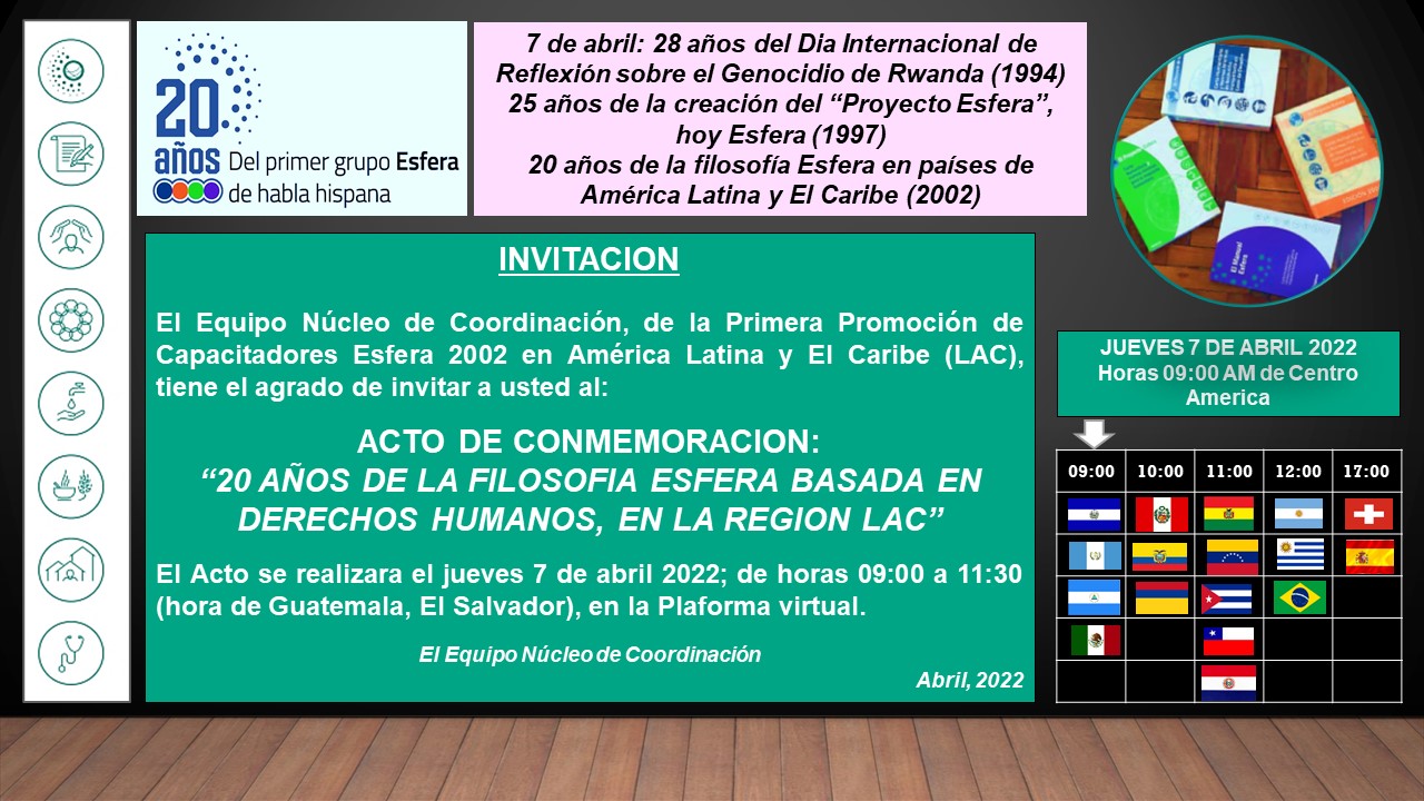 El Equipo Nucleo de Coordinacion de la Primera Promocion de Capacitadores Esfera (Lima, 2.002), organiza “20 Años de la Filosofía Esfera basada en derechos humanos, en la Region LAC”.