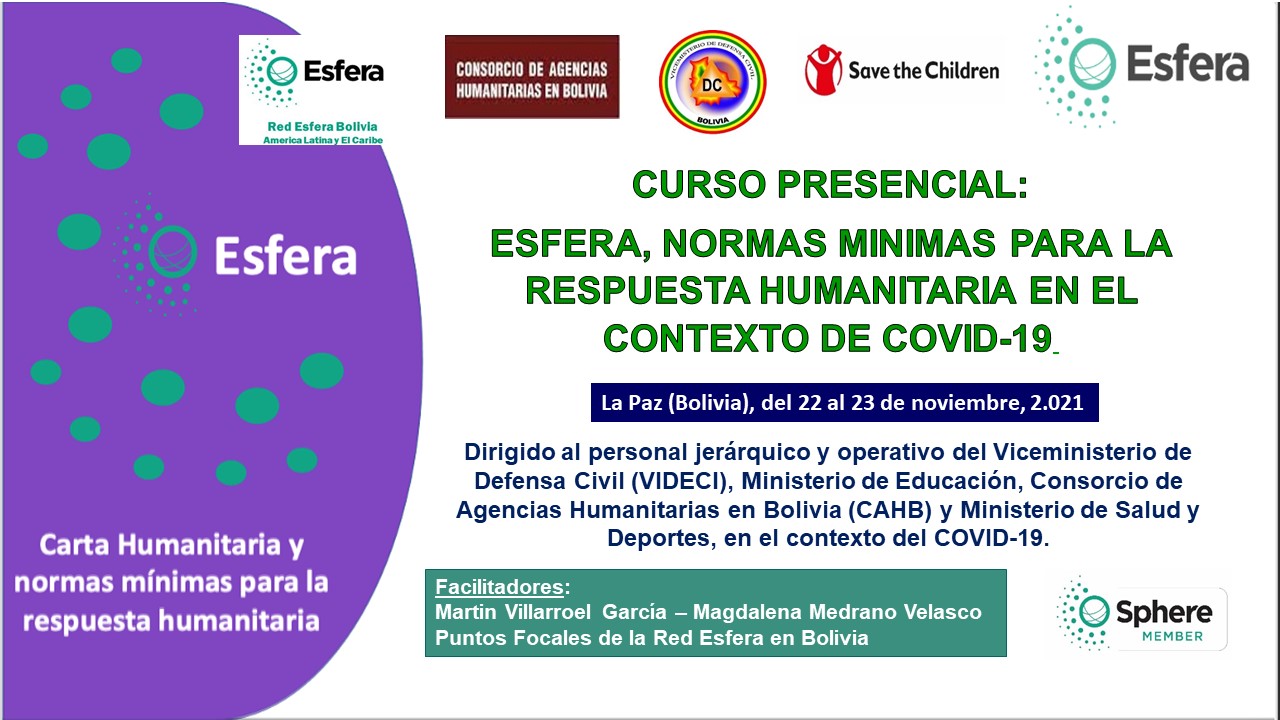 El objetivo del Curso es: “Formar a los participantes en nuevas competencias para fomentar la aplicación del Manual Esfera: Carta humanitaria y Normas mínimas para la respuesta humanitaria -en el contexto del COVID 19- como herramientas encaminadas a mejorar la calidad y la rendición de cuentas en las acciones humanitarias, compartiendo su experiencia y poniendo en práctica sus conocimientos”.