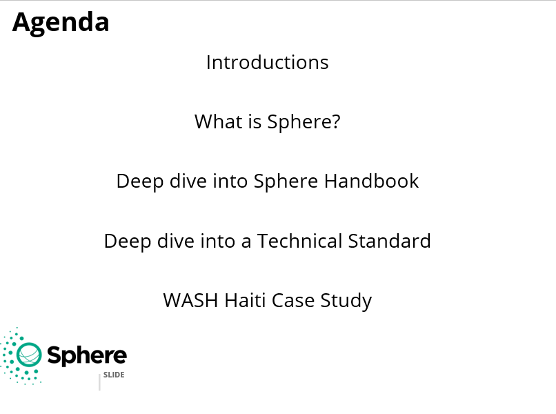 An interactive session involving a deep dive into the Sphere Handbook as well as watching the latest Sphere in Action video on WASH standards in Haiti.