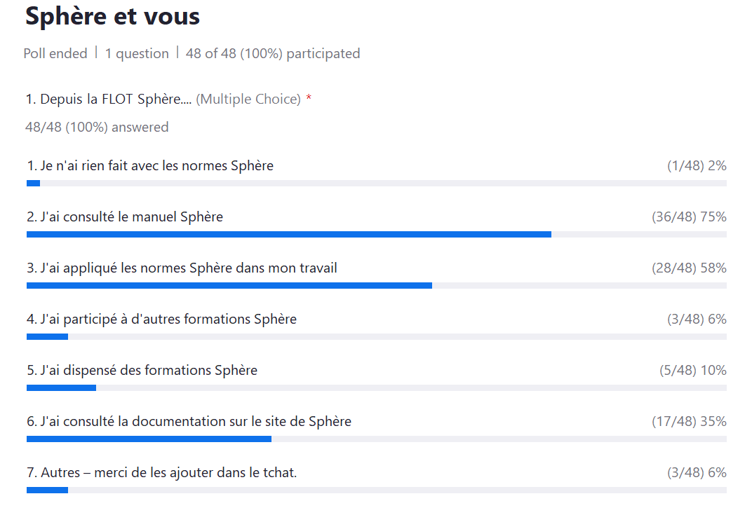Beaucoup de bonnes pratiques, d’échanges d’infos, et surtout d’enthousiasme pour le manuel Sphère…rdv en six mois pour la suite!