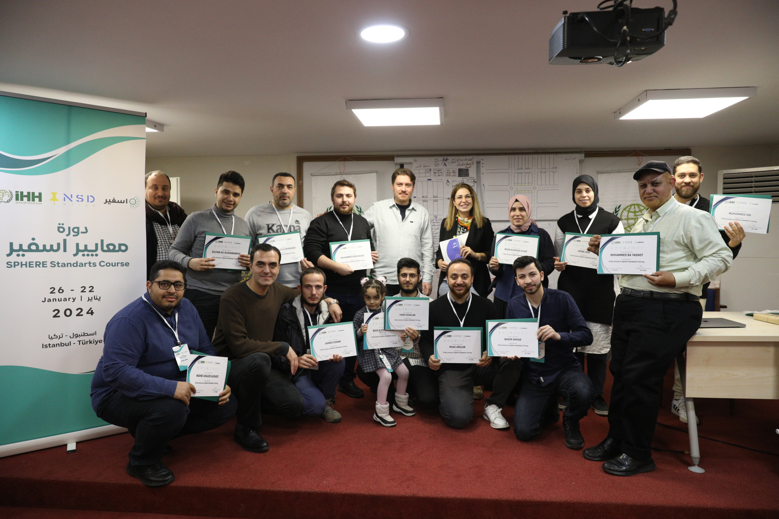 Aya Yagan, a certified Sphere Trainer and the Technical Director at NSDation, facilitated the program. The training occurred at the IHH community center in Istanbul, Türkiye, from January 22 to 26, 2024, conducted in Arabic. Fourteen participants (12 male, 2 female) attended.