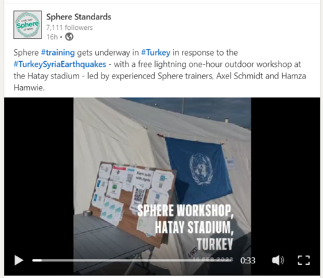 Sphere #training gets underway in #Turkey in response to the #TurkeySyriaEarthquakes – with a free lightning one-hour outdoor workshop at the Hatay stadium – led by experienced Sphere trainers, Axel Schmidt and Hamza Hamwie.