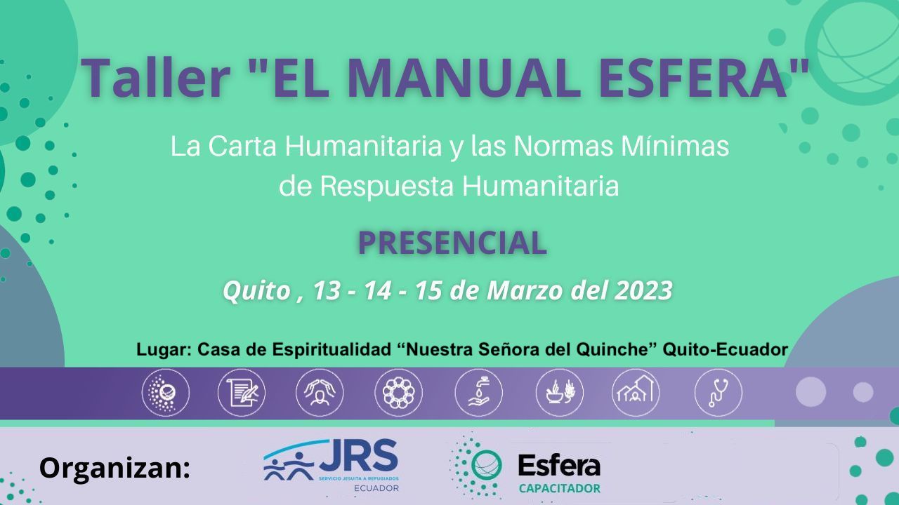 Taller modalidad presencial para técnicos encargados de proyectos en respuesta a la crisis de movilidad y acción humanitaria de Servicio Jesuita a Refugiados-Ecuador (SJR-EC) Ecuador. Con la participación de 20 asistentes y 3 entrenadores Esfera.
