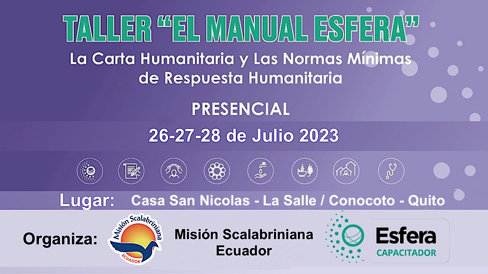 Taller modalidad presencial para personal que trabaja en acción humanitaria de la Misión Scalabriniana Ecuador. Con la participación de 25 asistentes y 3 entrenadores Esfera.