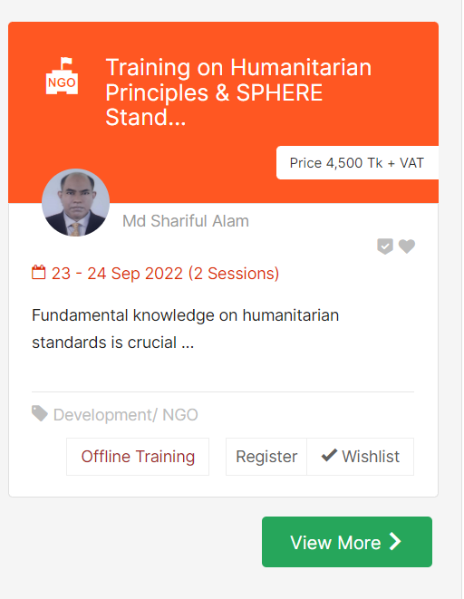 – To enhance knowledge on Humanitarian Principles, Protection Principles, Core Humanitarian Standards (CHS), Code of Conduct of Sphere Handbook to the humanitarian professionals of UN/INGO/NGO/GO in humanitarian actions.