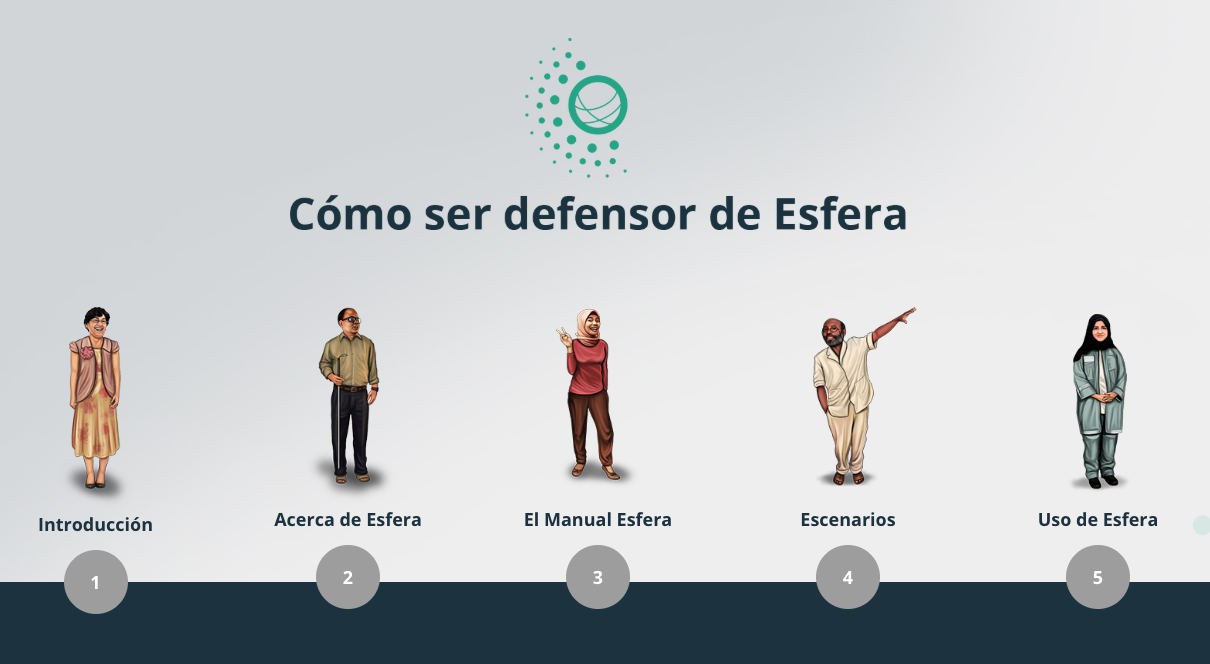 Este curso interactivo de una hora está dirigido a cualquiera que esté involucrado en la acción humanitaria que desee explicar mejor el enfoque de Esfera a la respuesta humanitaria. Miembros de la comunidad, trabajadores gubernamentales, trabajadores humanitarios, militares, capacitadores, directores de ONG y otros pueden aprender qué es necesario para promover Esfera dentro de una organización y alentar a empleados, compañeros y socios a adoptar e implementar las normas de Esfera.
