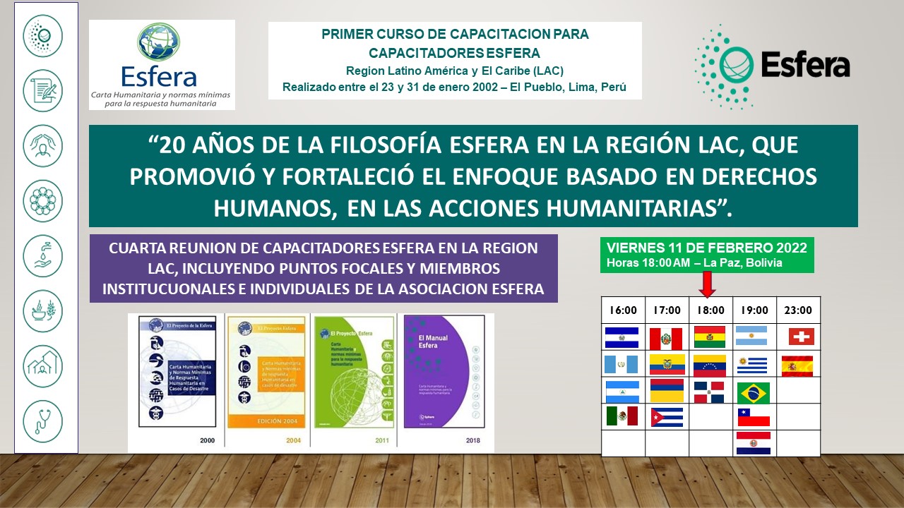 Con el objetivo de: “Conformar el Equipo de Coordinación y los Equipos de Sistematización, que implementaran el proceso de sistematización de experiencias realizadas por Puntos Focales, Capacitadores y Miembros Esfera; para resaltar la conmemoración de 20 años de la Filosofía de Esfera en la Región LAC, que promovió y fortaleció el enfoque con base en Derechos humanos, en las acciones humanitarias” se reúnen Puntos Focales, Capacitadores Esfera y Miembros de la Asociación Esfera.