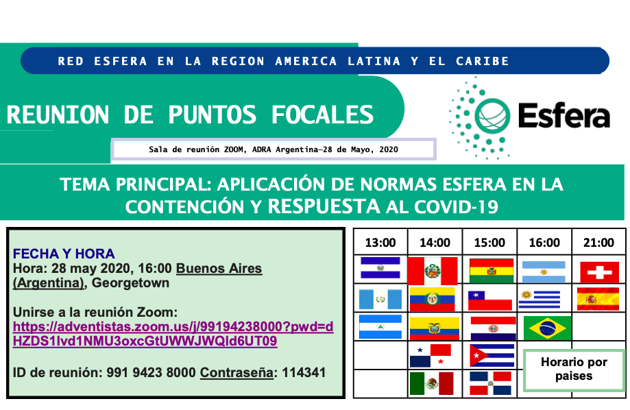 ???????? Esta reunión privada es dirigida a puntos focales y capacitadores de Esfera con sede en América Latina y el Caribe. Se entregará en español. Para obtener más informaciones, comuníquese con martinviga@yahoo.com.
