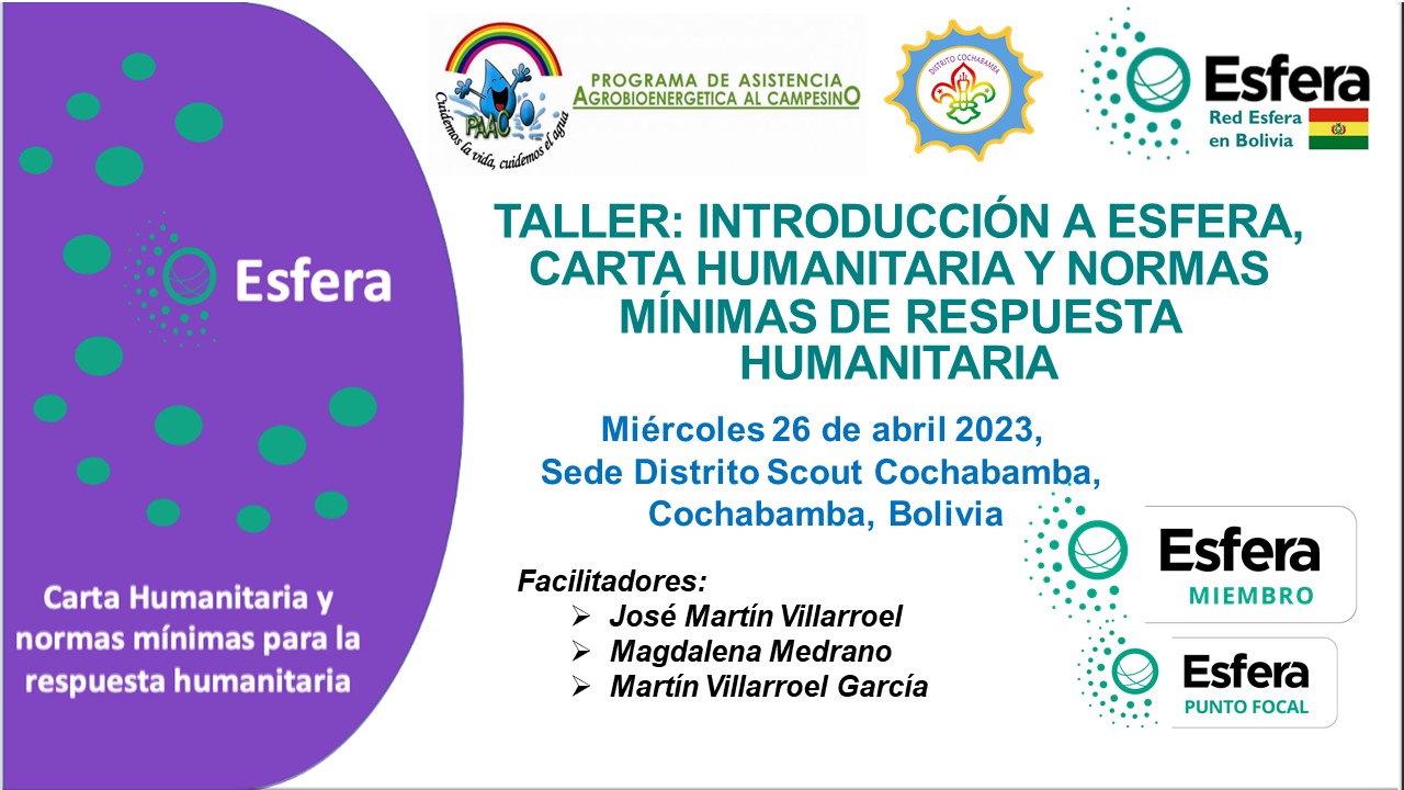 El Distrito Scout Cochabamba (Bolivia), conformado por 23 Grupos Scout, organiza el citado Taller que se realiza el miércoles 26 de abril 2023, con el objetivo de: “Formar a los participantes en nuevas competencias para mejorar la calidad de la respuesta humanitaria y promover la rendición de cuentas en las acciones humanitarias, aplicando el Manual Esfera: Carta humanitaria y Normas mínimas para la respuesta humanitaria”.
