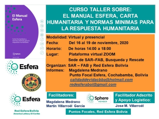 Curso Taller El Manual Esfera, Carta Humanitaria y Normas Minimas de Respuesta Humanitaria, Cochabamba y en línea, nov 2020