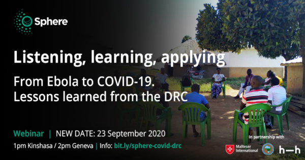 ????????  Sphere is hosting a series of webinars to share good practice and technical guidance on humanitarian standards in the COVID-19 response. This third webinar will explore how local community members and humanitarian actors in the Democratic Republic of the Congo are using best practices developed during the Ebola crisis to fight the current COVID-19 pandemic.