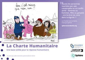 En 2014, Sphère a publié toute une série d’illustrations représentant les principes de la Charte humanitaire. Ces illustrations visaient à renforcer la sensibilisation à, et la compréhension de la Charte parmi les praticien-ne-s de l’humanitaire et les communautés affectées. Pour en savoir plus, veuillez vous rendre sur la page Internet de la Campagne d’illustrations.